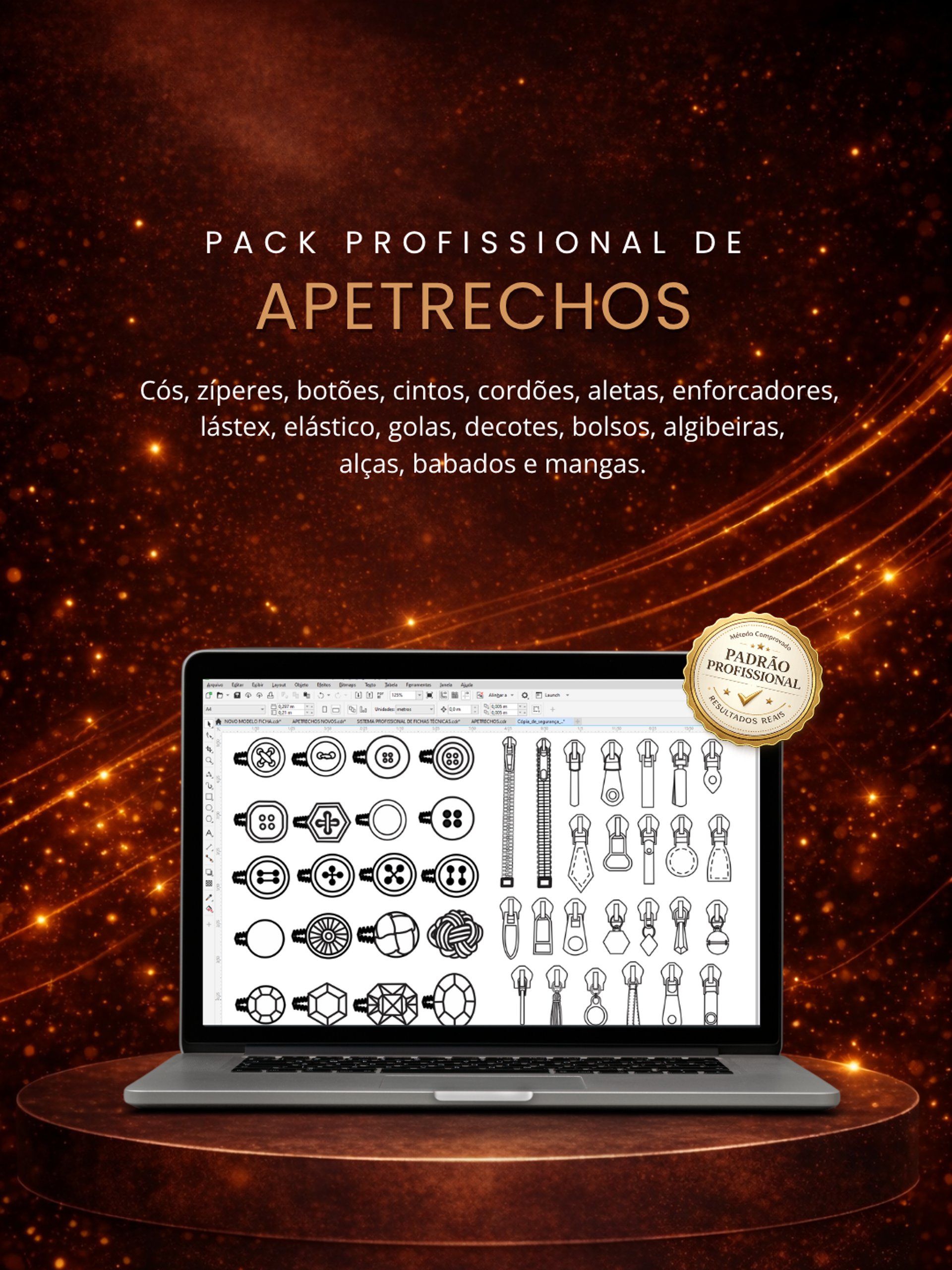 Com o pack de apetrechos, você tem acesso a elementos prontos como bolsos, golas, zíperes, botões, cintos, cós e muito mais — organizados para você aplicar diretamente nas suas peças.